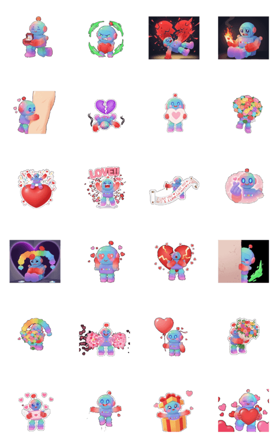 | スタンプ説明 | A heart-powered robot who glows pink whenever someone gets close. Cannot stop expressing affection. |