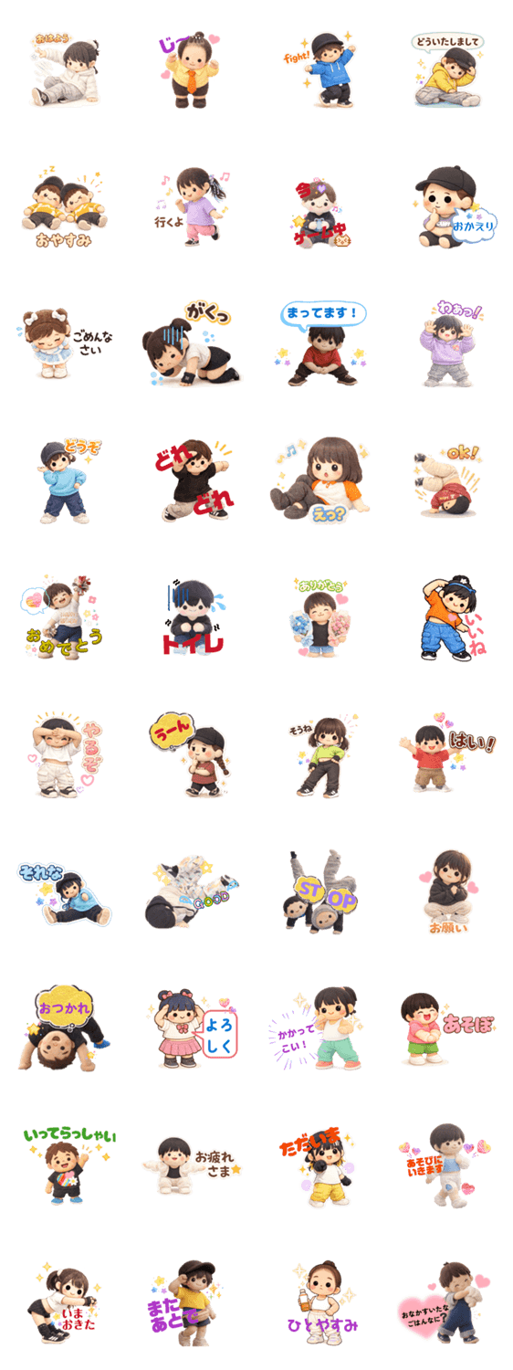 | スタンプ説明 | ダンスをしている人のスタンプです。実際にダンスをしている子のダンス中でのポーズやダンス前後の出来事などを参考にしてAIで制作しました。 |