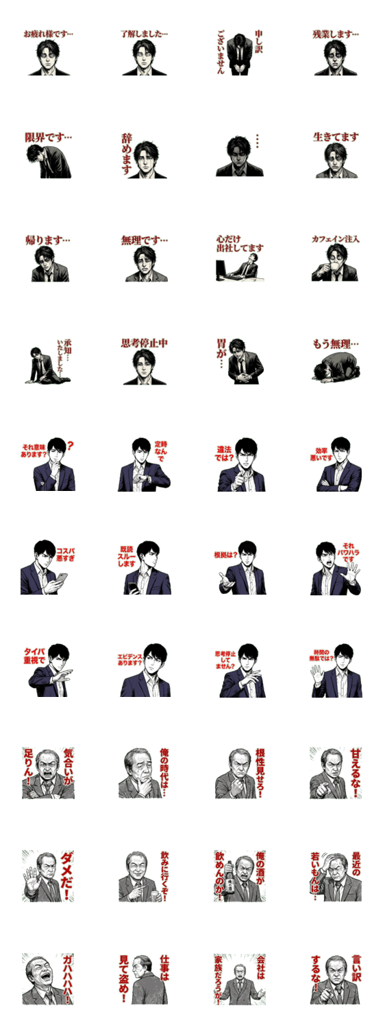 | スタンプ説明 | 月140時間残業の劇画調ハードボイルド男子が贈る、共感しかない職場の叫び40種。「有給申請」「定時で帰ります」「それ意味あります?」現代社畜の心の代弁者。 |