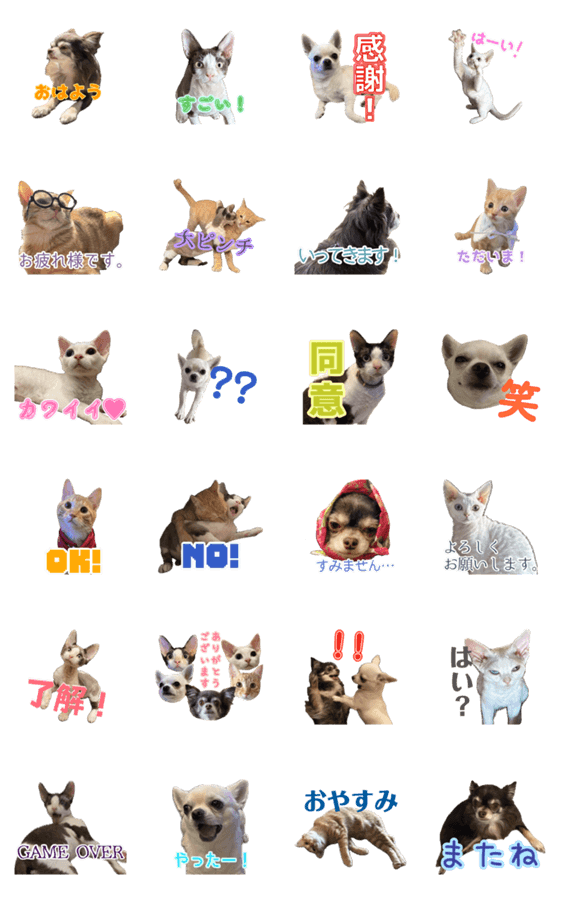 | スタンプ説明 | 日常生活で使えるチワワ2匹、デボンレックス2匹、茶トラ1匹のLINEスタンプです。犬猫が大好きな方におすすめです。 |