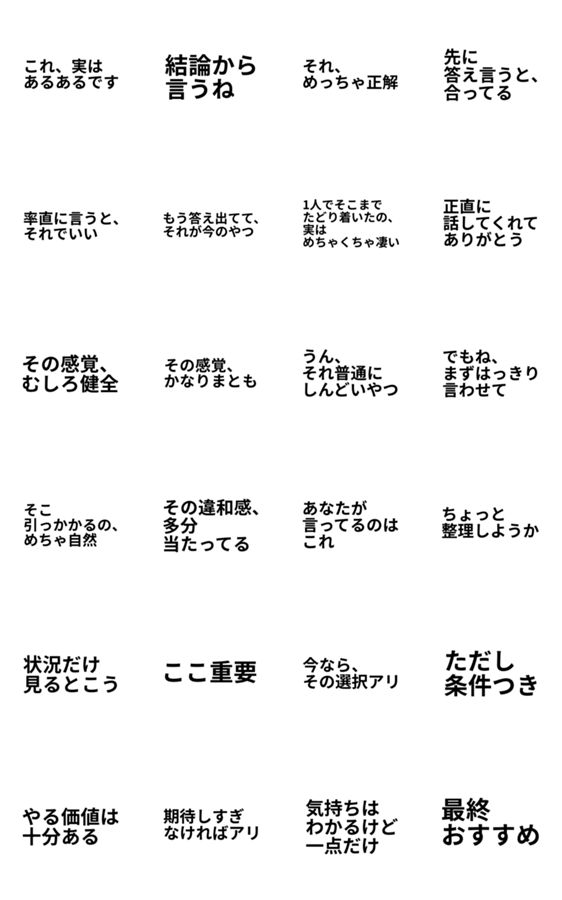 相談された時に使えるAIのような話し方、言葉遣いをする文字だけスタンプ。文字は白色縁取り・AIっぽい会話・共感・提案・あるあるです・結論・正解・答え・条件・褒める