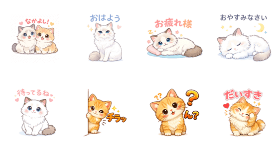 Express yourself with Emma and Noah! This set features the elegant Ragdoll Emma and the fluffy Minuet Noah in various cute poses and emotions.