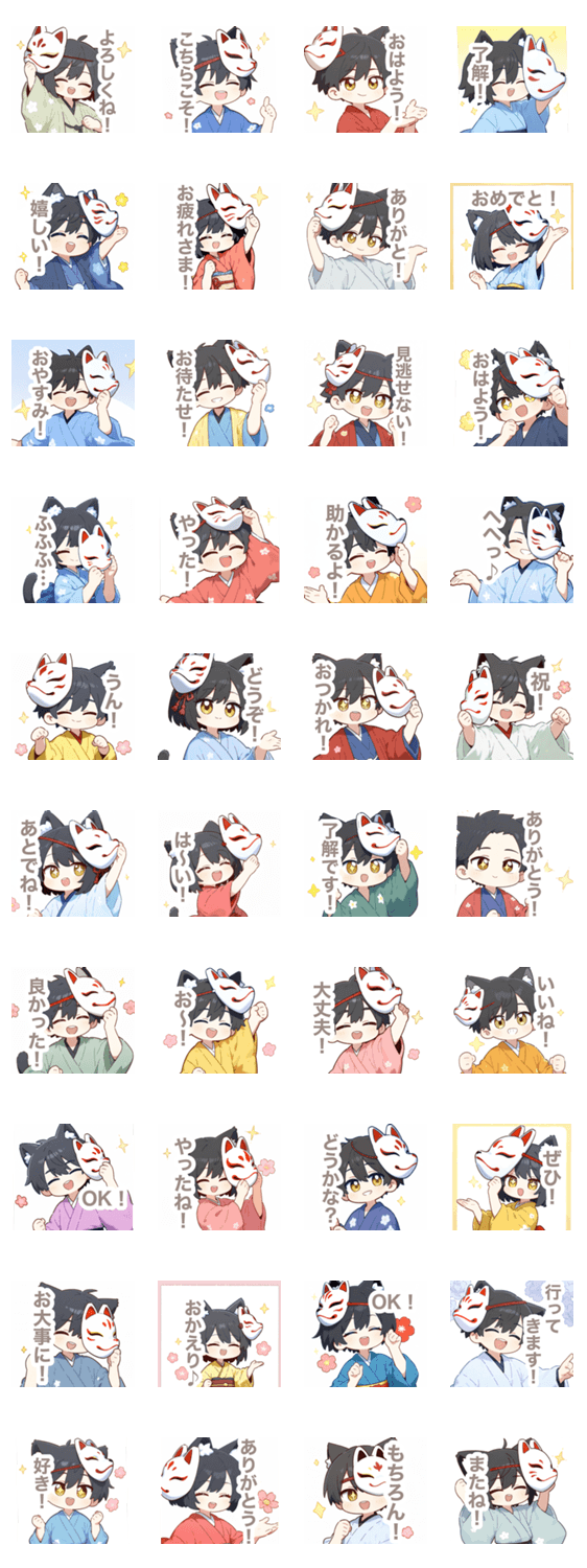 日常的なセリフ付きです。狐のお面/和風/着物/猫耳/男の子/男子/女の子/女子/かわいい/日常/毎日/挨拶/会話/ミニキャラ/ちびキャラ/チビキャラ