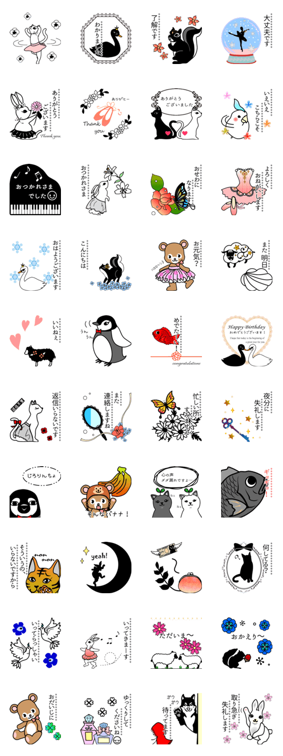 | スタンプ説明 | ネコ好きも ウサギ好きも テディベア好きも 花好きも バレエ好きも、可愛いもの大好きな大人女子に贈るスタンプ。基本も可愛いもギュッと詰め込みました♪色は少なめで綺麗 |