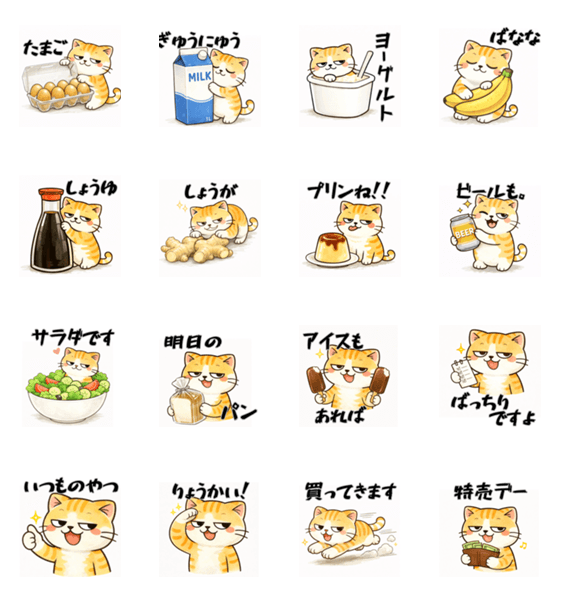 「たまご」「ぎゅうにゅう」など、買ってきてほしいものを ゆるかわいい猫のイラストと一緒に送れるので、 家族や友だちへのおつかい・買い物のお願いに、毎日使える♪