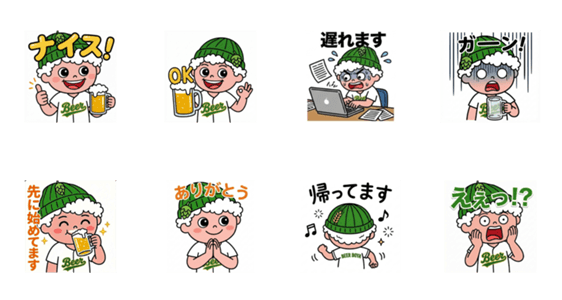 | スタンプ説明 | 緑のホップ帽が目印の「ビール坊や」が登場!ビール仲間や家族・友人との日常使いに。表情豊かなビール坊やと楽しく会話しよう! |