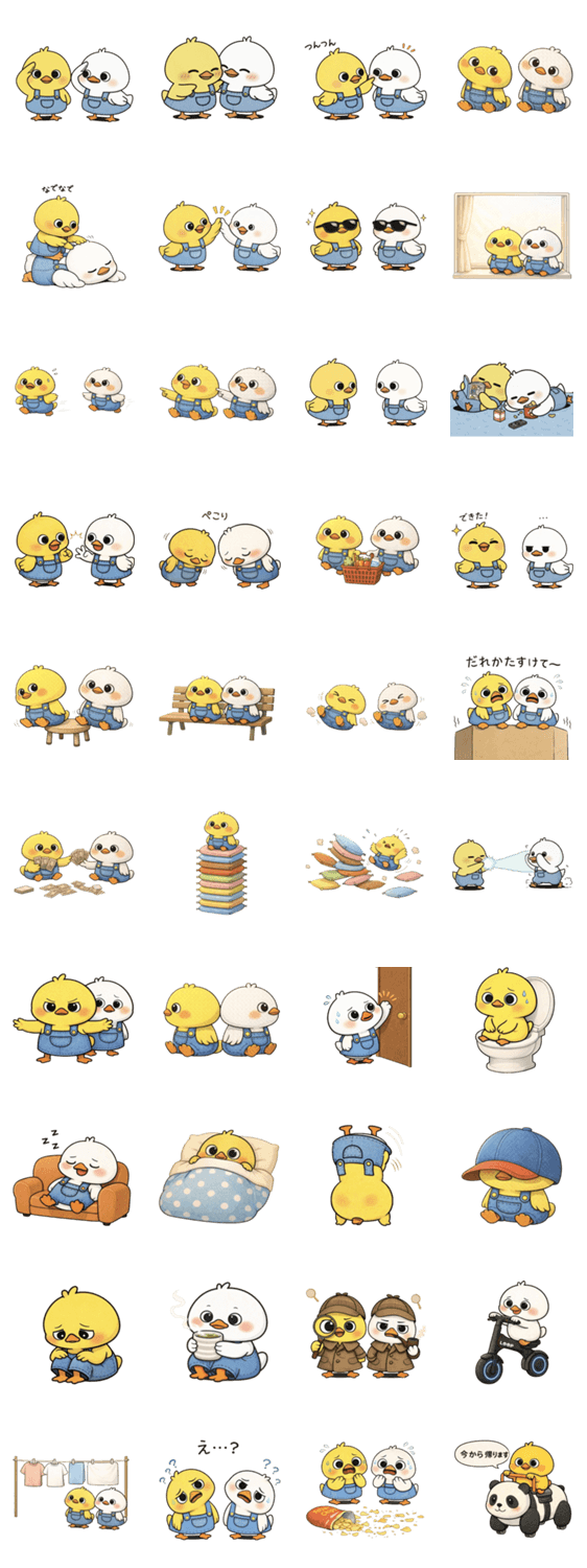 | スタンプ説明 | なかよしなひよことあひるの、ほっこりした日常スタンプです。 あいさつ・お返事・ちょっとした気持ちまで、毎日のトークで使いやすいセットです。 |