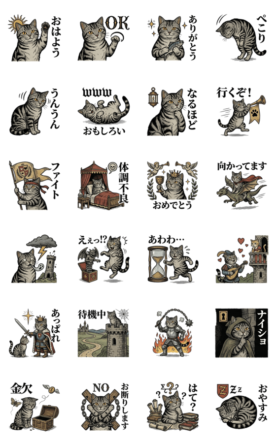 | スタンプ説明 | The kingdom of U-chan, an American shorthair kitten. The touch is reminiscent of a medieval woodblock print. |