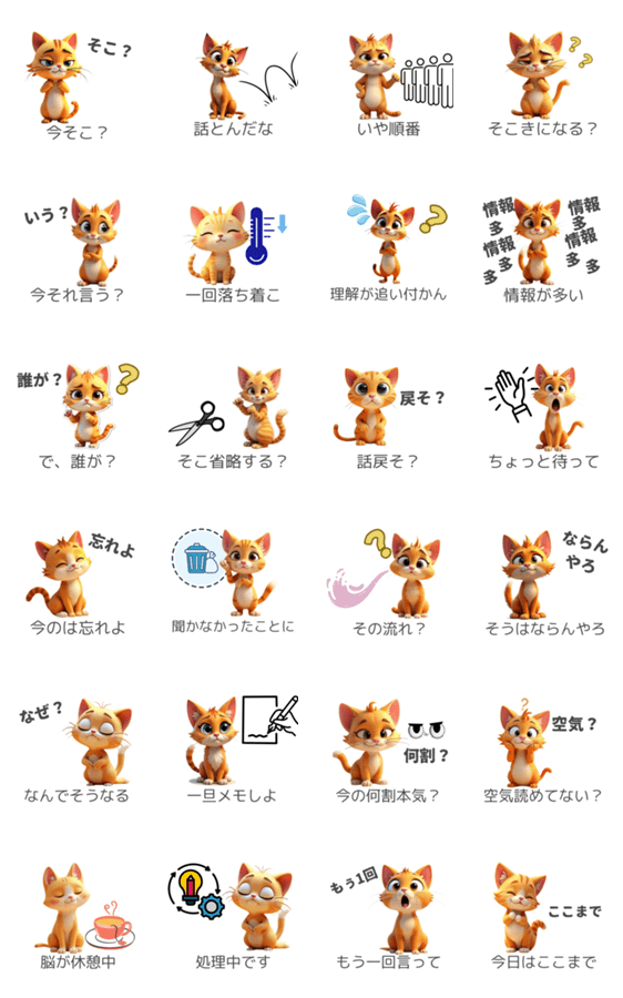 ちょっとズレた反応がクセになる、ギャグ特化の3Dねこスタンプ第2弾。困惑・沈黙・ツッコミなど、会話の温度を下げたい時に使えるリアクションを24個収録。