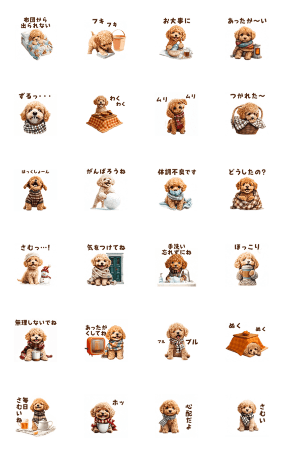 寒い冬に大活躍❄️ 風邪、疲れているとき、寒い日の挨拶や相手を気づかうやさしい言葉が入った家族・友達・仕事でも使いやすい子犬トイプードルのアニメーションスタンプ