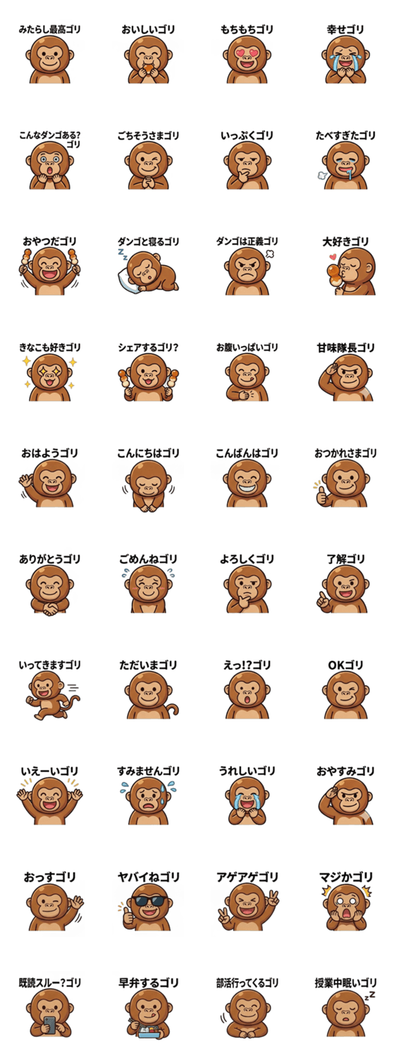 強靭な体、心は甘党!お団子が大好きな『ダンゴリラ』が、お団子への愛を届けるためにやってきました。友達を笑顔にしたい時にぴったりのスタンプです。