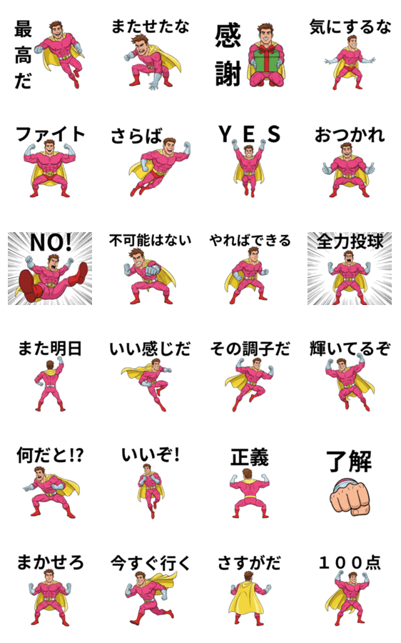 どこか親しみのあるヒーローが「その調子だ」「また明日」など、会話で使いやすい言葉を届けます。 励ましも、締めも、気負わず使える日常向けヒーロースタンプです。