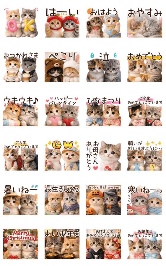 | スタンプ説明 | 飛び出す猫の一年中使えるイベントスタンプ♡母の日/クリスマス/正月/お正月/バレンタイン/夏/冬/動く/挨拶/可愛い/ポップアップ/パステル/子猫/三毛/茶トラ/山田まぽん作 |
