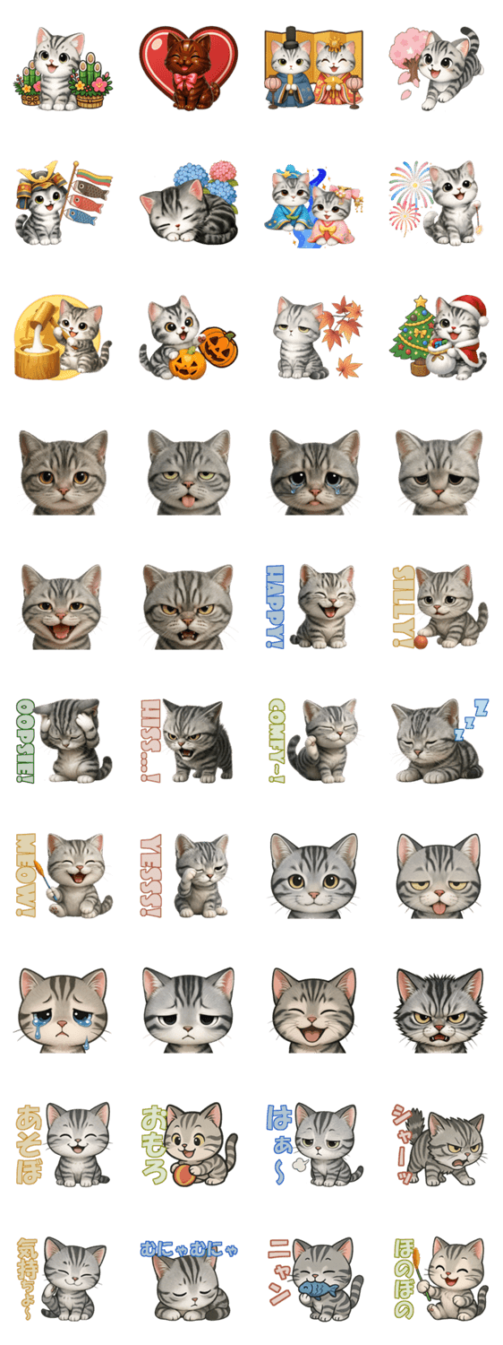 季節イベントから日常のひとコマまで気持ちが全部伝わる! 一年じゅう使える万能スタンプ! 表情豊かなアメリカンショートヘアが、あなたのトークをほっこり彩ります。