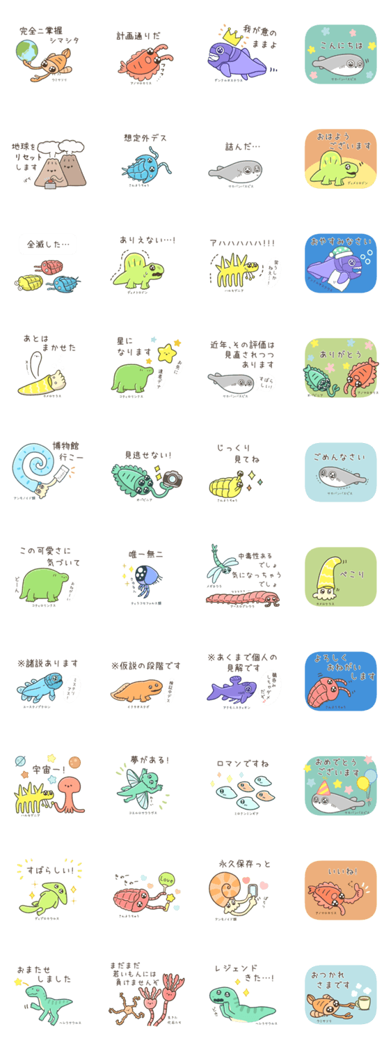 宇宙人のような古生代の生き物。アノマロカリス、サカバンバスピス、ダンクルオステウス、ウミサソリ、ディメトロドン、アンモナイト、三葉虫。古生物、絶滅、かわいい。