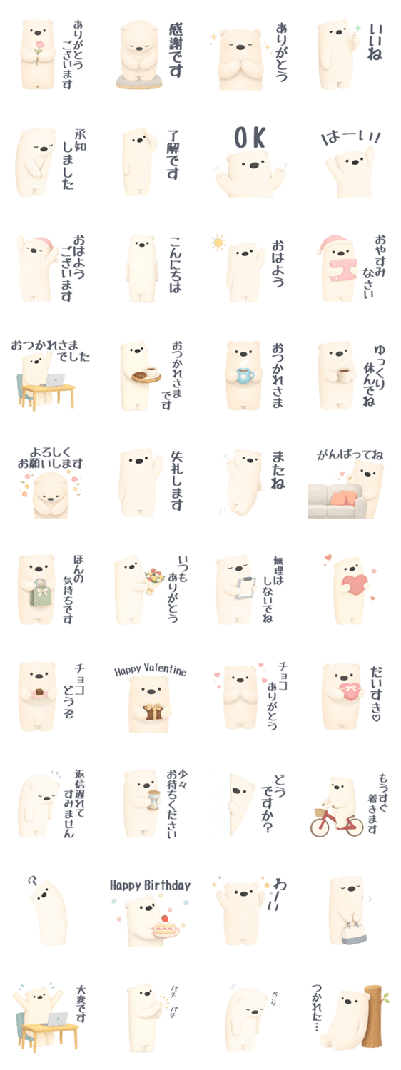 | スタンプ説明 | 北欧テイストのシロクマがあなたの気持ちを伝えてくれます♡シンプルなデザインで日常でも使いやすい☆告白/感謝/バレンタイン/挨拶 |