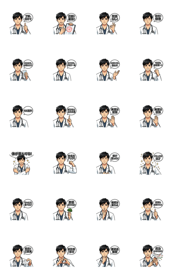 白衣のイケメン医師が、あなたの健康を毎日サポート!頼れる先生の言葉で日常会話がもっと楽しくなります。医師ならではのユーモアも満載。