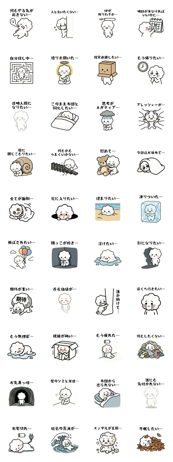 ネガティブな気分の時に。何もしたくない、そんな本音をふわふわネガティブちゃんが代弁します。