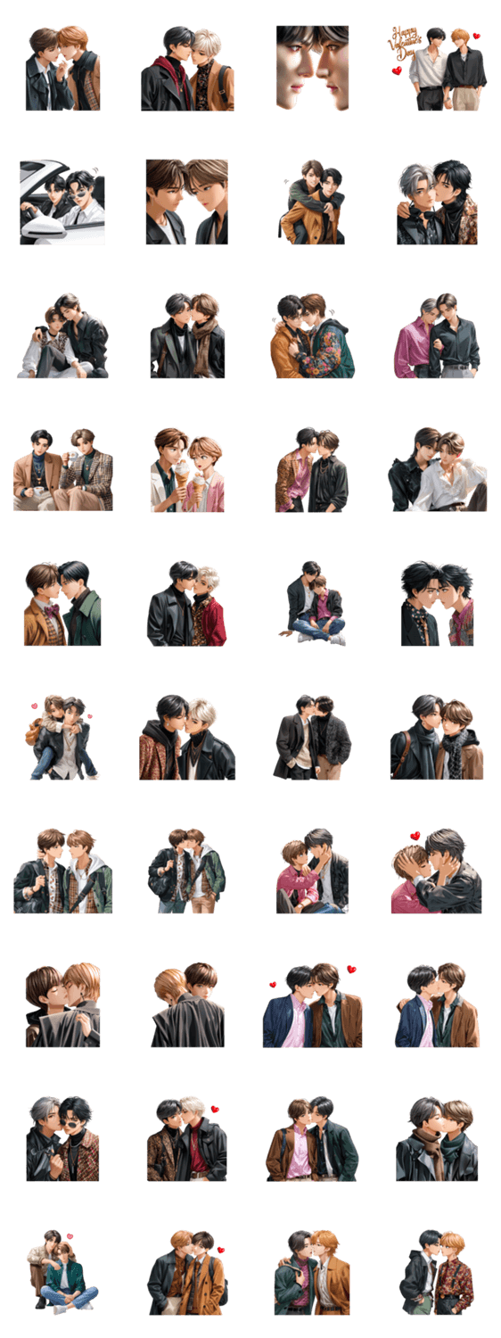 | スタンプ説明 | ボーイズラブ、BLカップルLGBTQゲイ、男性同士の恋、やおい、耽美(ダンメイ)クィア、イケメン、恋人・彼氏、プライド月間、ハッピーバレンタインデーマンガ・アニメ |