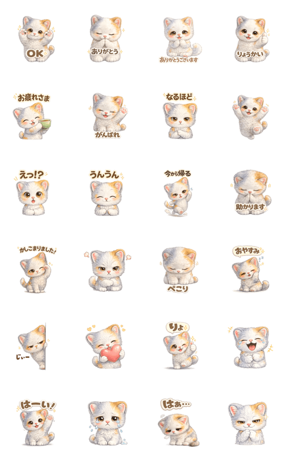 敬語&日常で使えるミックススタンプ。ぬいぐるみのような可愛い猫スタンプです。