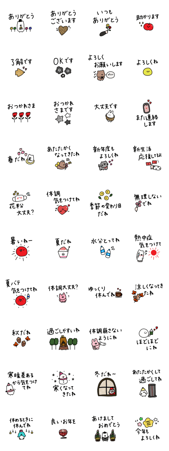 | スタンプ説明 | 一年通して使える一つあると便利なスタンプです。大人可愛い♡春夏秋冬。気遣い言葉入り。お正月いり。 |