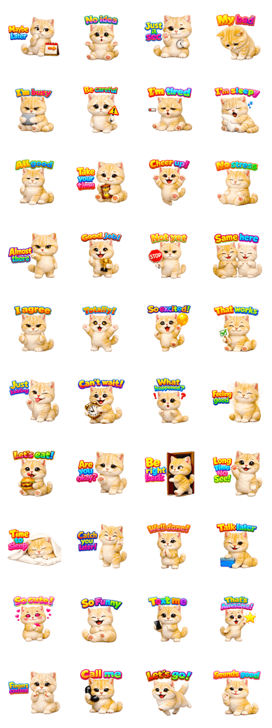 | スタンプ説明 | cute cat, chubby cat, fluffy cat, 3D cat, chibi cat, line stickers, daily phrases, english chat stickers, kawaii cat, adorable cat |