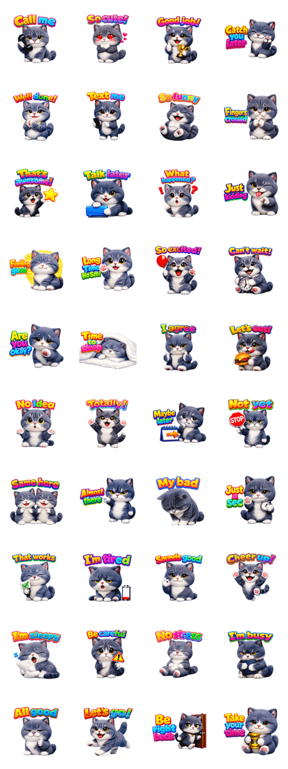 | スタンプ説明 | cat, gray cat, cute cat, chibi cat, 3d cat, kawaii, cute stickers, daily chat, reaction sticker, cat emoji, funny cat, text stickers |