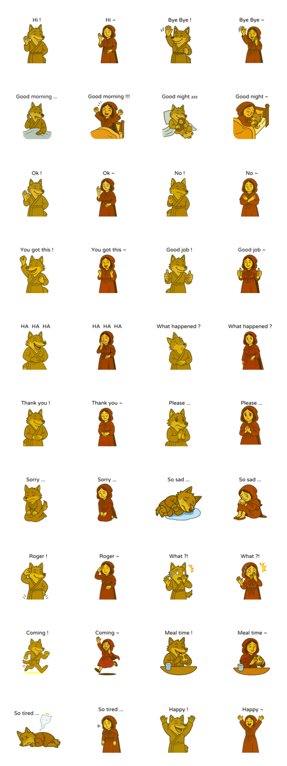 | スタンプ説明 | English version of the daily life stickers featuring Big Wolf and Little Red. |