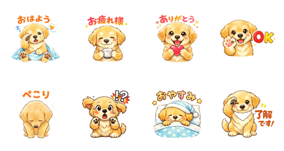 | スタンプ説明 | A cute fluffy Golden Retriever puppy sticker set with joyful expressions Perfect for greetings thanks and daily chats |