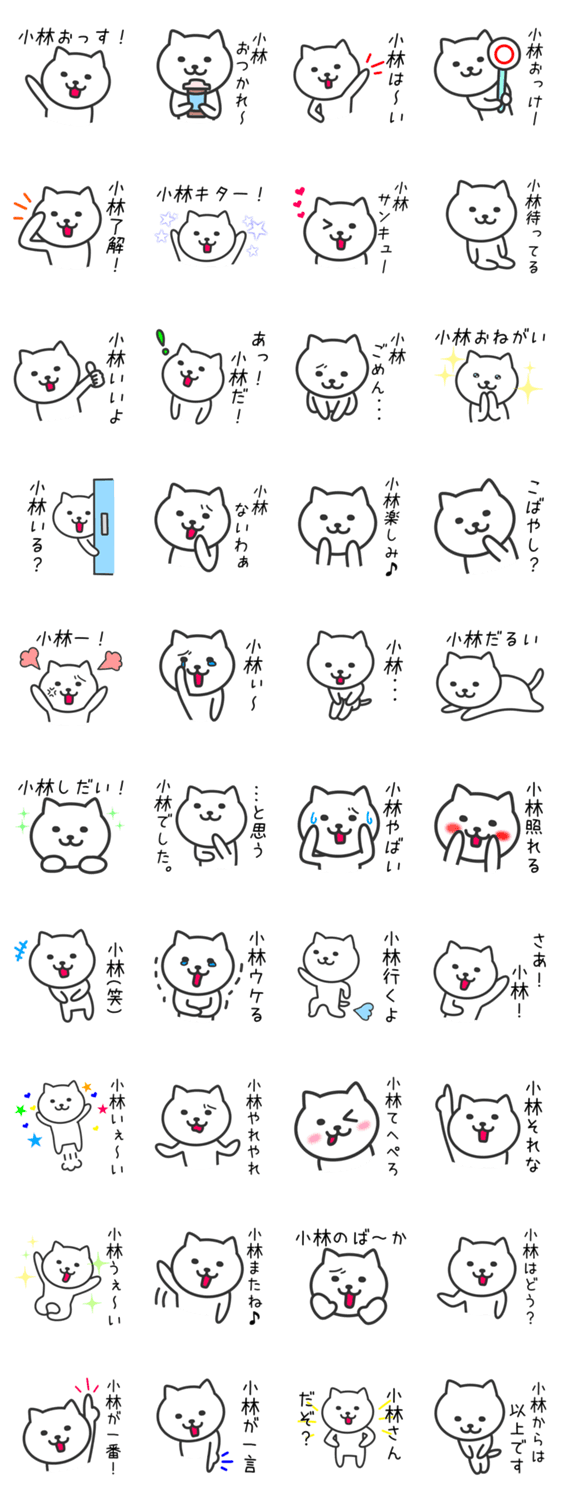 名前が小林(こばやし)の人専用のネコのスタンプです。小林さん本人が使うのも、小林さんに対して使うのにも適しています。日常会話やネタとして使えるねこです。