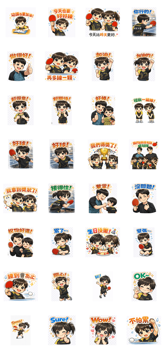 | スタンプ説明 | Original Q-version elementary school table tennis team stickers, including practice, competition, awards, and encouraging messages, suitable for everyday chat. |