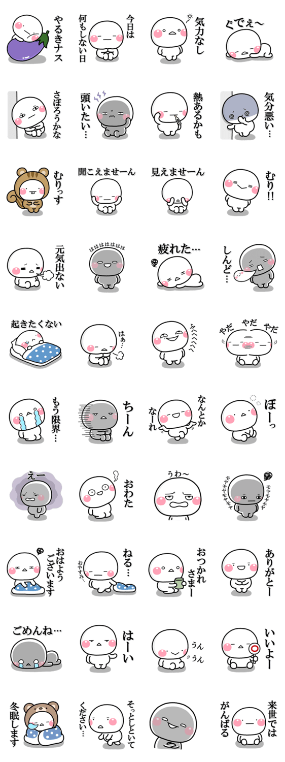 | スタンプ説明 | 大人気シリーズのしろまるのやる気がないときに使える特別なスタンプです。内容を厳選し作成しました。大人フォントver【作:いしいともこ】 |