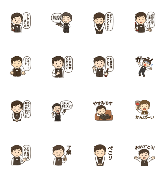| スタンプ説明 | 飲食店・レストラン勤務のウェイター・ソムリエ向けスタンプ 「かしこまりました」「ありがとうございます」など、現場で使える丁寧語から仲間との会話まで幅広く対応。 |