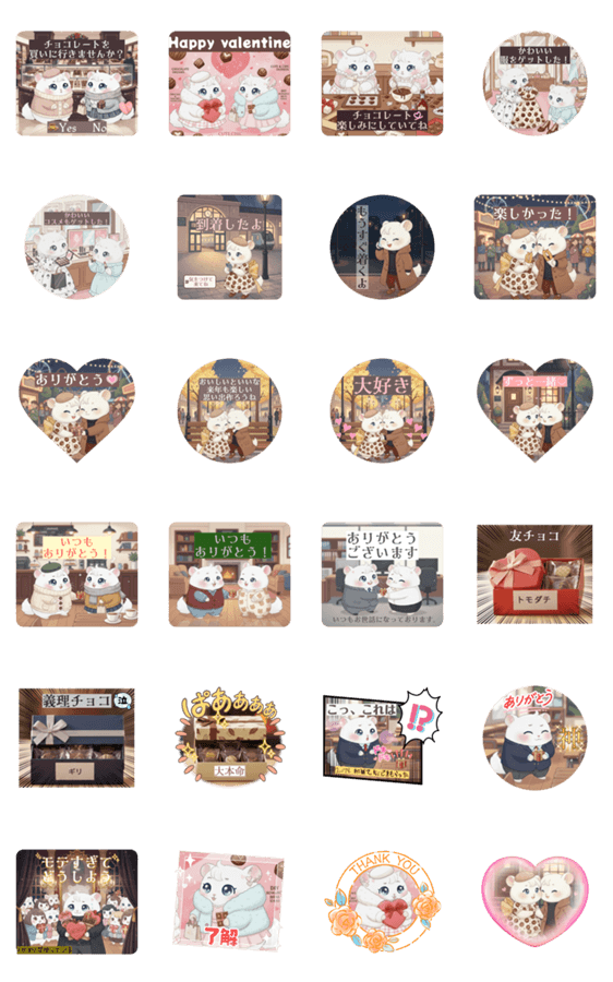 | スタンプ説明 | キュート/ロマンチック/バレンタイン/待ち合わせ/チョコレート/大好き/ずっと一緒/職場/同僚/家族/恋人/友達/本命/友チョコ/義理チョコ/ずっと使える/使いやすい |