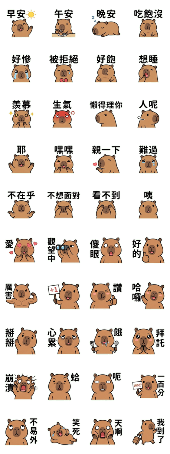 | スタンプ説明 | A cute capybara sticker set featuring simple, everyday phrases for daily conversations. |