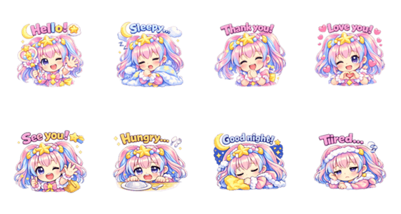 | スタンプ説明 | パステルカラーの魔法少女が、 「Thank you !」「Hungry」など 毎日のトークで使いやすい気持ちを英語で伝えます。 |