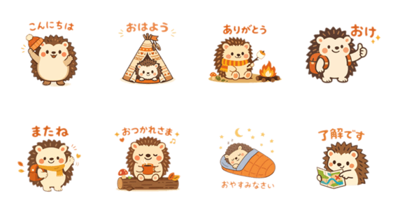 | スタンプ説明 | キャンプが大好きなハリネズミの可愛いスタンプです。「おはよう」「おつかれさま」など日常でよく使う言葉をセットにしました。キャンプやハリネズミ好きの方とのトークに |