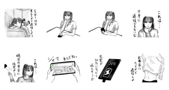 何と無く返信がおっくうな時に考えた手描きのスタンプです。3番目と4番目のスタンプはセットで連投して使えます。【注意】送っても怒らない関係性の人に使って下さい。