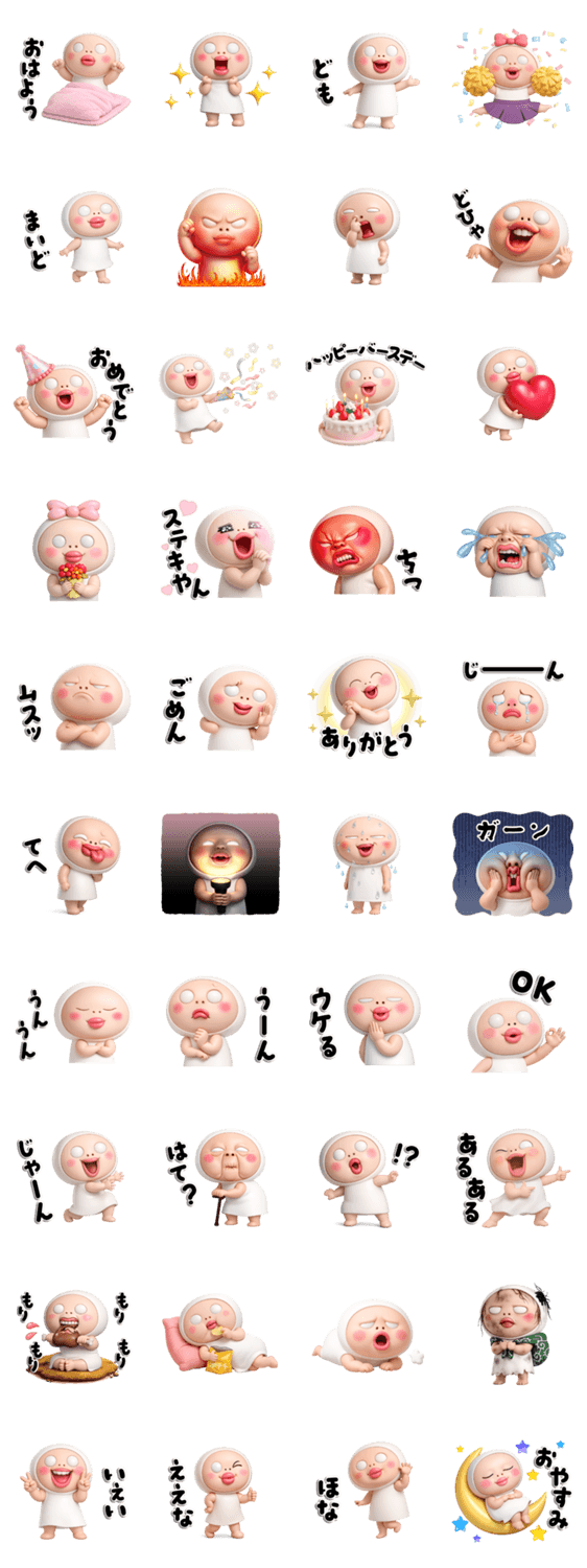 | スタンプ説明 | 可愛いだけじゃない、しろめちゃんの1年中使える3Dスタンプが登場。よく使う挨拶や相槌ほか、文字少なめで送りやすい仕様です。変顔/キモカワ/立体/誕生日/あいさつ/ネタ |