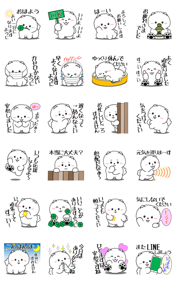 ふわふわの白いポメラニアンの優しい気遣いや思いやりのある言葉のスタンプです。