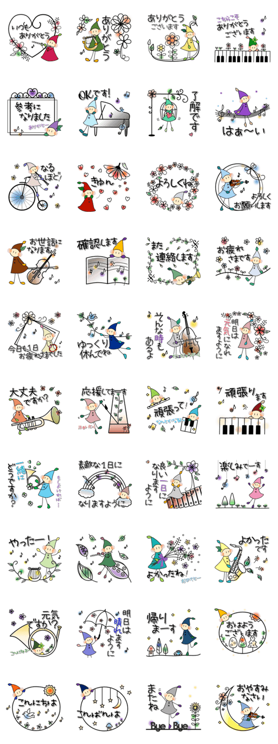 | スタンプ説明 | 大人かわいい楽器・音楽編 です。ピアノ、バイオリン、トランペット、クラリネット、などなど楽器とお花いっぱいの日常に使えるスタンプです! |