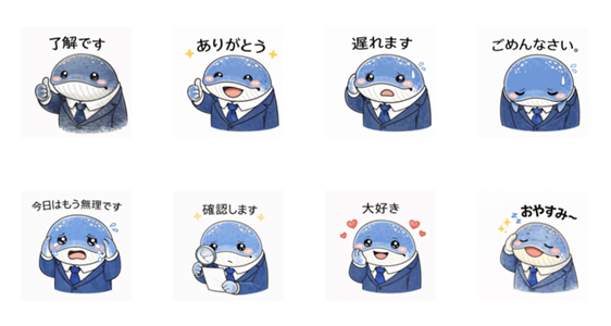 | スタンプ説明 | A cute yuru-chara style humpback whale in a business suit. Soft funny stickers for work chats daily replies and gentle office communication. |