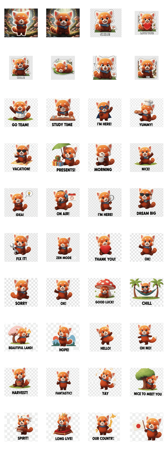 赤いマフラーを巻いたレッサーパンダの可愛いスタンプです。喜怒哀楽豊かな表情と、挨拶や返信に便利なメッセージ