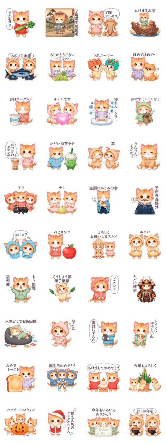 | スタンプ説明 | パーカーを着たネコのスタンプ。猫/ねこ/ネコ/毎日/連絡/挨拶/日常/家族/友達/動物/パーカ/正月/年賀状/お祝い/年中/毎日使える/まかセロリ/流行語/1年中/ダジャレ |
