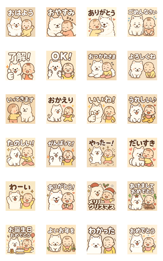 | スタンプ説明 | 赤ちゃんとサモエド犬が一緒に過ごすほのぼのとした日常を描いた、一年中使えるLINEスタンプ24個セットです。 |