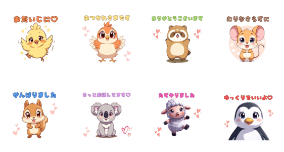 | スタンプ説明 | Cute, soothing animal stickers that relax your heart just by looking at them. Perfect for gently showing care to someone special who is doing their best. |