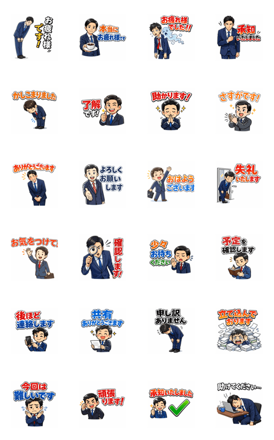 | スタンプ説明 | ビジネスや日常で毎日使える、スーツ姿のサラリーマン敬語スタンプです。丁寧な返信に特化したフレーズを厳選。忙しい大人の時短コミュニケーションに最適です。 |