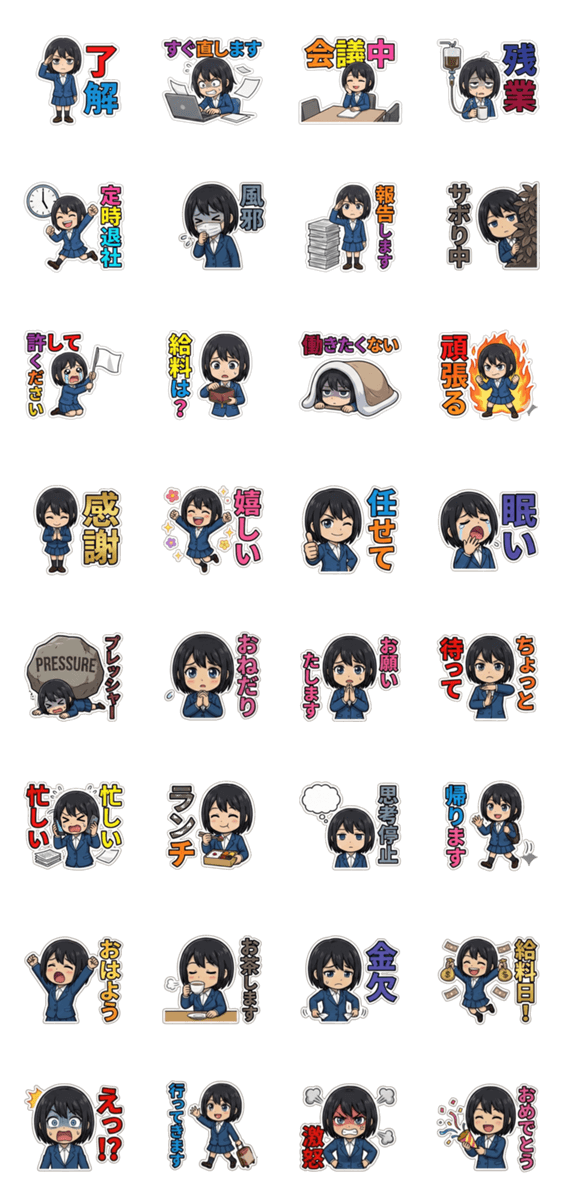 | スタンプ説明 | 毎日のお仕事お疲れ様です。残業、給料日、定時退社など、職場で使いやすいリアクションを集めました。同僚や上司への返信にも! |