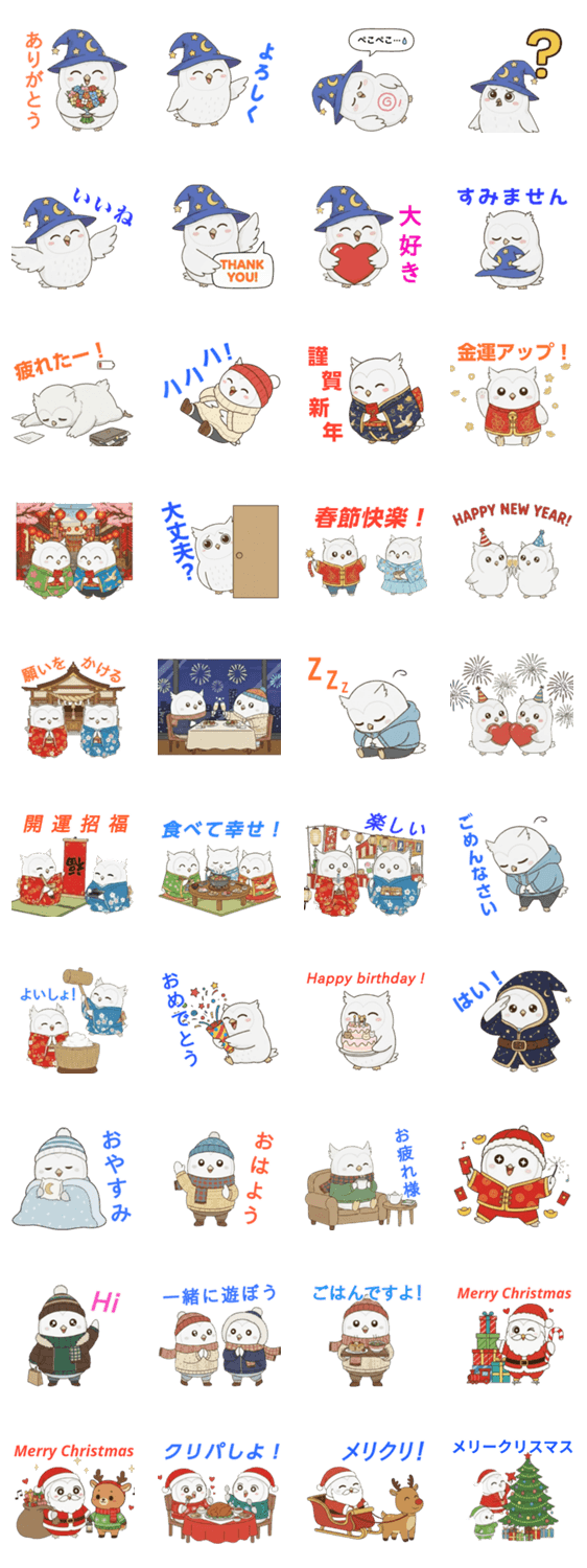 | スタンプ説明 | 魔術士のシロフクロウ「小雪丸」が登場!クリスマスや春節など冬のトークを癒やしと幸運で彩ります。まんまる可愛い仲間たちと一緒に、チャットをマジカルに盛り上げよう! |
