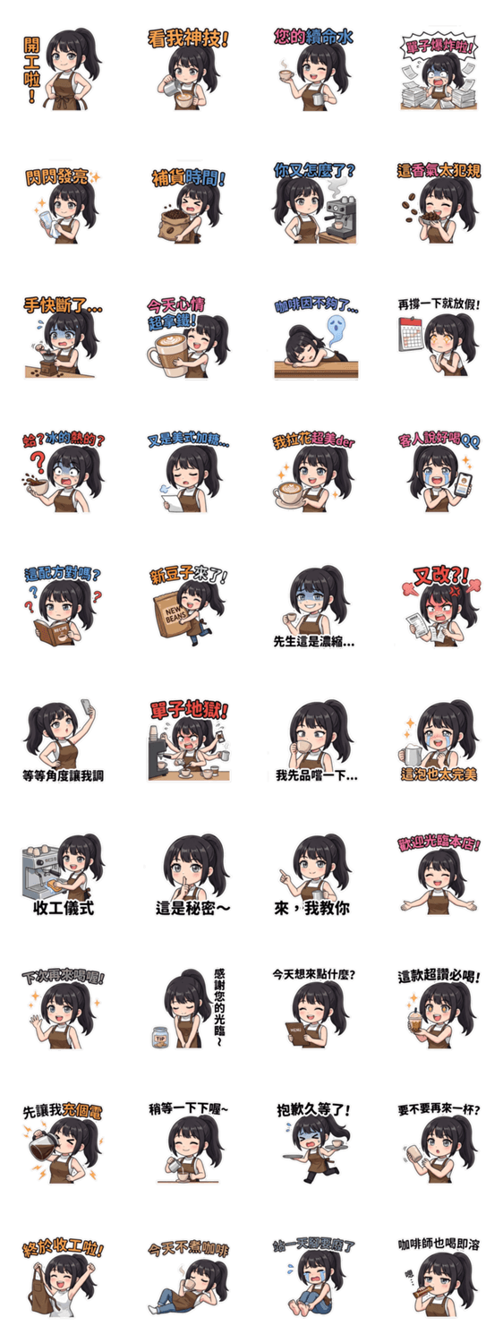 | スタンプ説明 | 元気なアニメ風バリスタが登場!「一杯どうぞ」から「ラテアート」まで、カフェの日常やコーヒー愛をトークで使おう。コーヒー好き必見! |